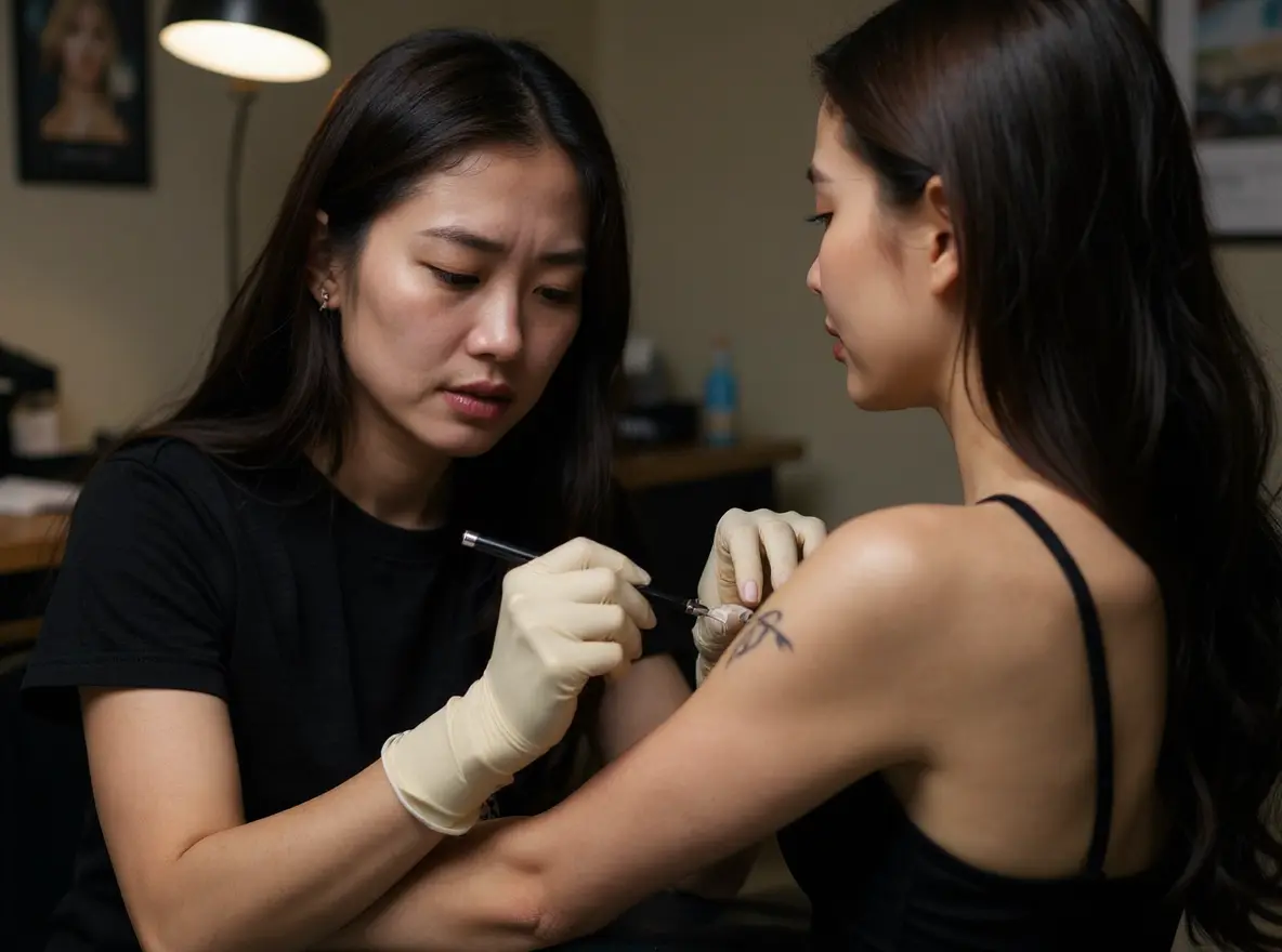 เมื่อดีไซน์พร้อม ช่างจะพิมพ์ลายลงบนผิวด้วยกระดาษสติ๊กเกอร์สัก (stencil) เพื่อเป็นแนวทาง จากนั้นจึงเริ่ม “ลงเข็มจริง” เสียงเครื่องจะเริ่มดังเบาๆ ความรู้สึกเจ็บเริ่มมา แต่ช่างมืออาชีพจะคอยเช็กความสบายของลูกค้าอยู่เสมอ พวกเขาไม่ได้แค่ “สัก” แต่กำลัง “วาดภาพด้วยเลือดและหมึก” ทุกเส้นต้องแม่น ทุกน้ำหนักมือต้องคุมให้เท่ากันตลอด